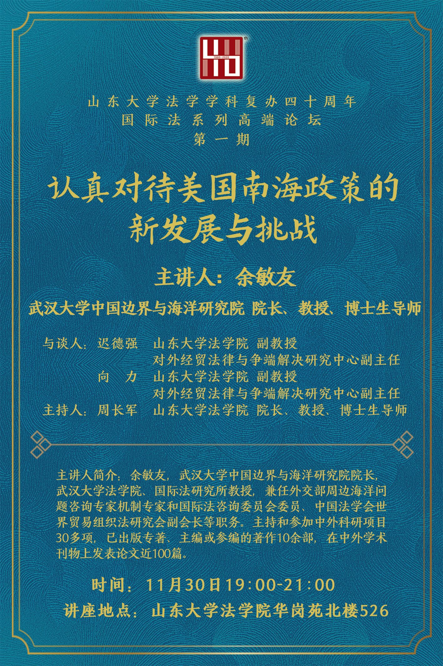 威尼斯144777视频官网法学学科复办四十周年国际法系列高端论坛第一期:认真对待美国南海政策的新发展与挑战