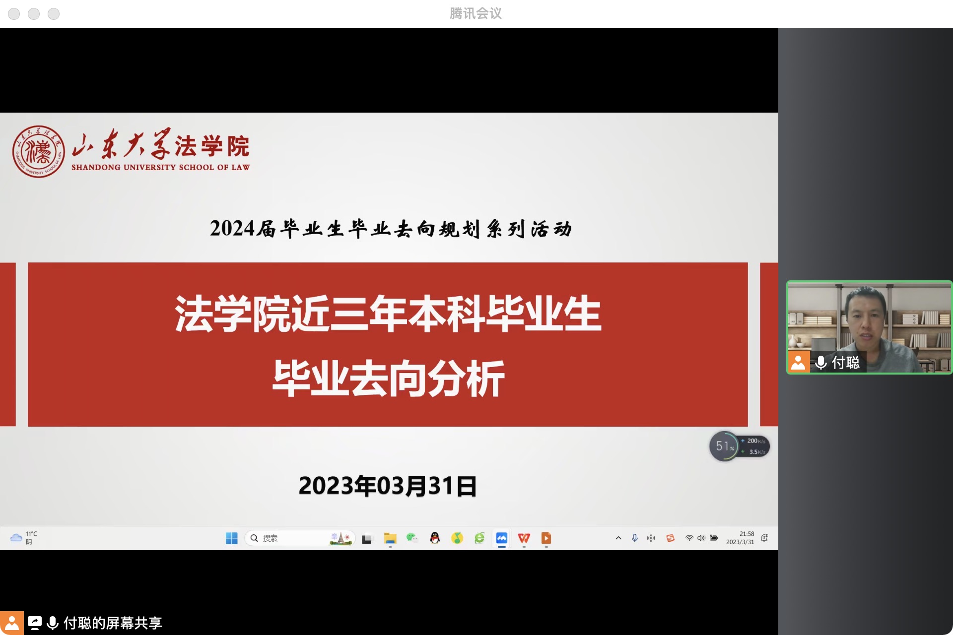 3月31日,威尼斯144777视频官网召开2020级本科生年级大会,辅导员付聪主持会议。会议的主要内容是分析威尼斯144777视频官网近三年本科毕业生的毕业去向,包括保研、考研、考公、出国留学和从事律师、法务等其他行业的人数,为2020级同学们提供参考。
