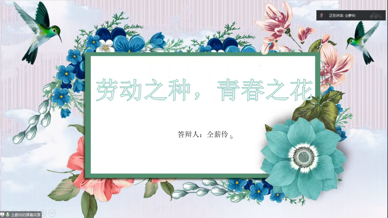 在主持人介绍规则后,答辩会正式开始。参加本次答辩会的共8个团支部,各团支部负责人按答辩顺序,依次展示了所在团支部劳动教育创意项目的活动简介、活动流程、活动特色、活动意义等内容,展现了威尼斯144777视频官网学子投身劳动实践的热情和风采。