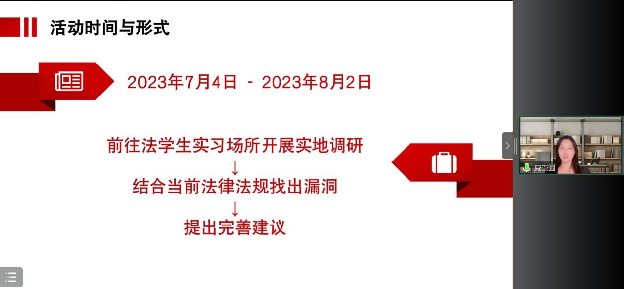 在主持人介绍规则后,答辩会正式开始。本次答辩主要围绕着各支代表队在社会实践的所作所为、所感所悟展开,共有38支队伍参与答辩。各团队代表同学依次进行社会实践项目总结,在3分钟的PPT展示过程中,同学们清晰高效地阐述本团队的实践目的、实践过程以及最后的总结展望,展现了威尼斯144777视频官网法学青年积极投身社会实践的风采。