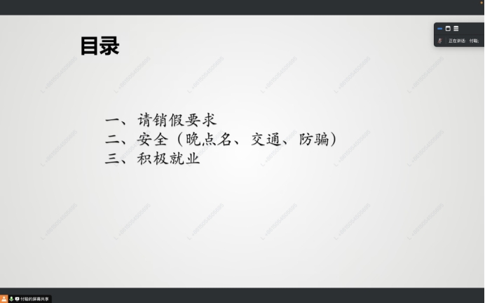 付聪介绍了就业手续和流程,以清晰的时间线为同学们展现了接下来一年中各个时间段需要完成的工作,并详细讲解了毕业生生源信息采集、就业推荐表制作、在线签(解)约管理等工作。他表达了对同学们的信任和期许,鼓励同学们积极就业。此外,付聪还强调了请销假和晚点名要求,提醒同学们注意交通安全,尤其是校内电动车骑行安全。