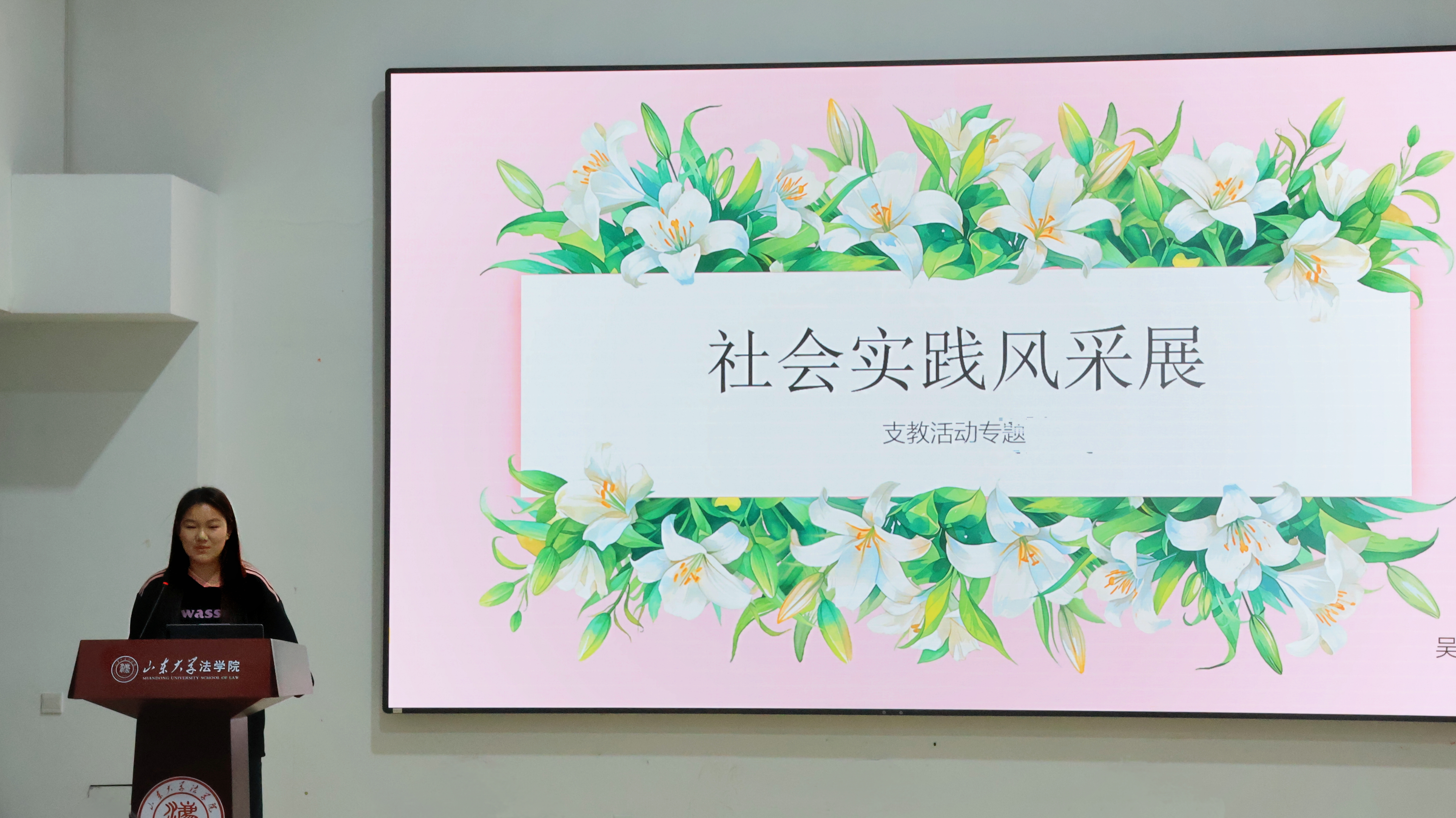 社会实践活动先进个人姚家乐以“实践归来话实践”为题,从亲身经历出发,向同学们分享了许多优秀经验。她特别提醒同学们,一定要注意留痕,及时留档,并进行整理归纳。此外,她结合自己的实际经历,告诉同学们遇到突发状况时要及时沟通,稳定心态,也可以求助指导老师,灵活应对。