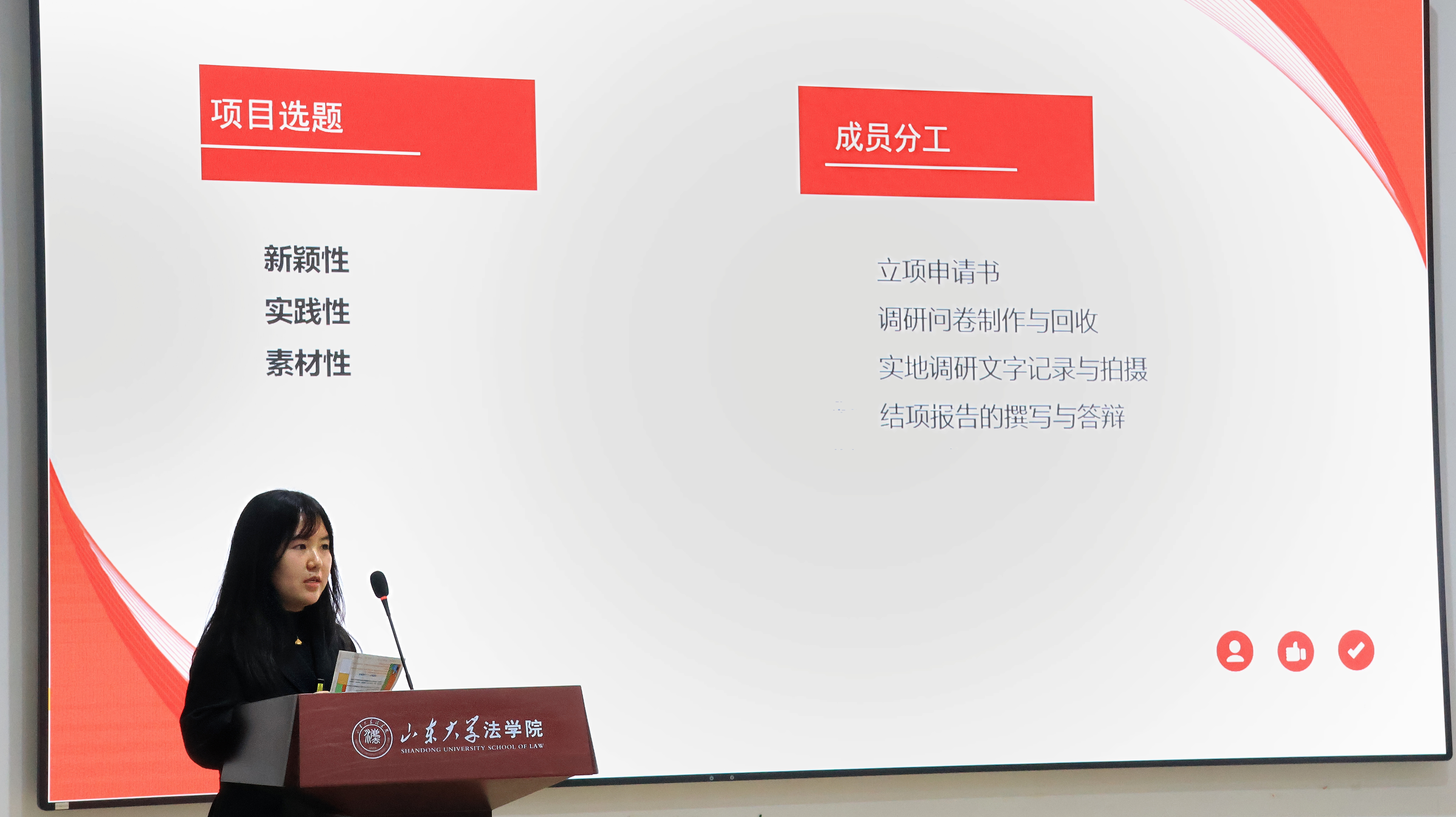“普法明义”实践团的郑泽宁认为,项目选题要具有新颖性、实践性和素材性,在实践调研中要及时留下丰富的图片和文字记录。此外,她还特别分享了团队对于结题成果总结撰写的经验,如做好目录、注意格式、详细脚注等,使在场同学受益良多。