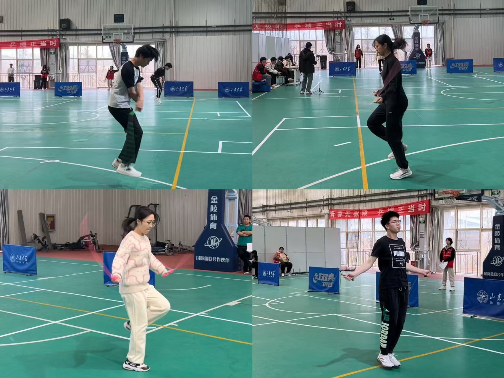 随后的集体项目各学院代表队摩拳擦掌,高手云集。4×30秒单摇接力项目气氛最为紧张激烈,各运动员屏息静听起跳指示,闻“令”而动依次接力,任翔璇、金宇菲、李欣芮、陕青华四人配合,反应灵活,以469的优势夺得项目第二名。3分钟10人长绳“8”字跳中,队员依次起跳,面对失误,队员之间相互鼓励,稳住心态坚持不懈,展现体育竞赛的团结精神。