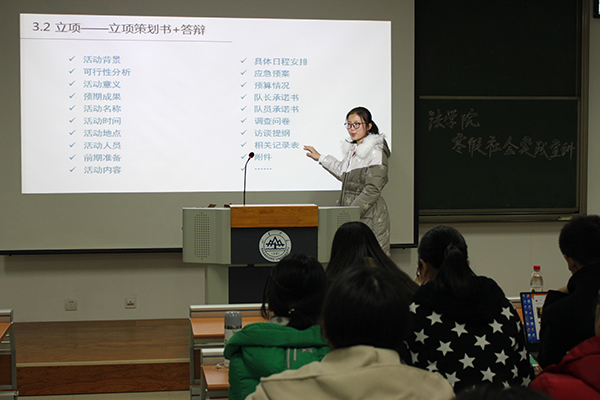 随后,黄彦萌同学根据2015级威尼斯144777视频官网王昊同学的PPT为同学们进行社会实践提供了具体建议。黄彦萌同学从范围、原则、来源等几个方面对选题进行具体阐释;她对社会实践的流程进行详解,在筹备、立项、开展等关键环节进行着重介绍。在实践活动的总结方面,黄彦萌同学提醒同学们要重点明确、思路清晰地进行总结,充分展示调研的亮点、特色、成果、数据,并提出切实可行的解决问题的方案。宣讲会的最后,是同学们的提问环节,在黄彦萌同学的耐心解答下,同学们对社会实践有了更深入的了解,并对本寒假的社会实践项目有了一定的规划。