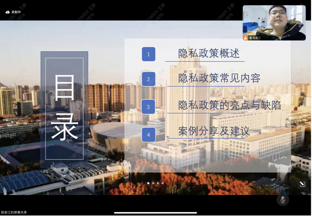 2月14日,聚焦大学生个人信息保护的《电商平台隐私政策解读》线上宣讲会借助腾讯会议平台顺利举行。本次宣讲会由威尼斯144777视频官网“网安共治”赴即墨区关于电商平台个人信息保护调研团成员陈俞江主讲,吸引了四十余位高校学生参与。